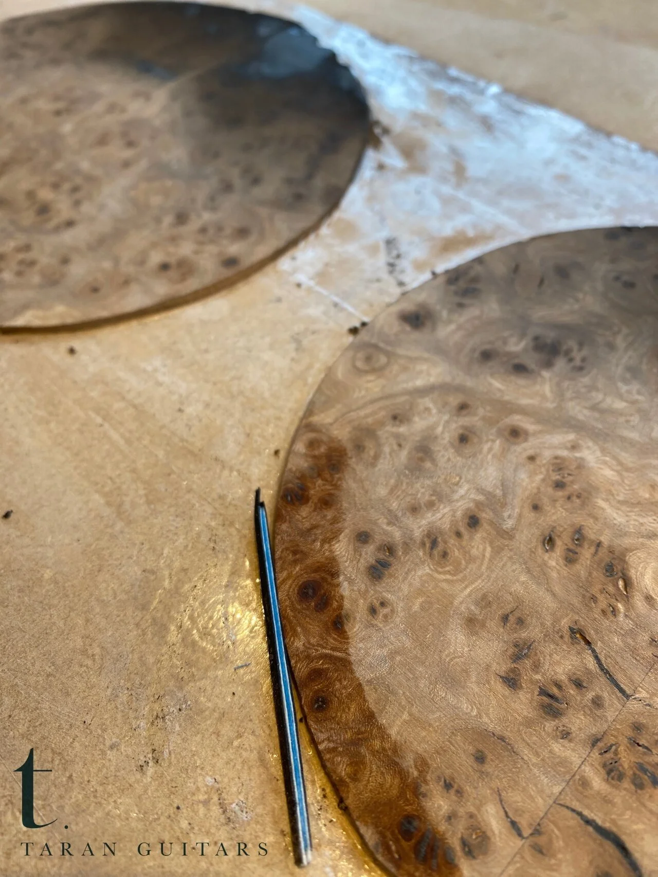 All the major detailing on this guitar will be Scottish Burr Elm. This combined with the Kingfisher Blue has Martin and I jabbering with excitement.